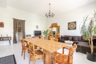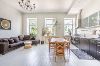 Кухня-гостиная 36 м² с тремя окнами во внутренний зелёный двор. Пространство для встреч, тёплых вечеров и больших столов.