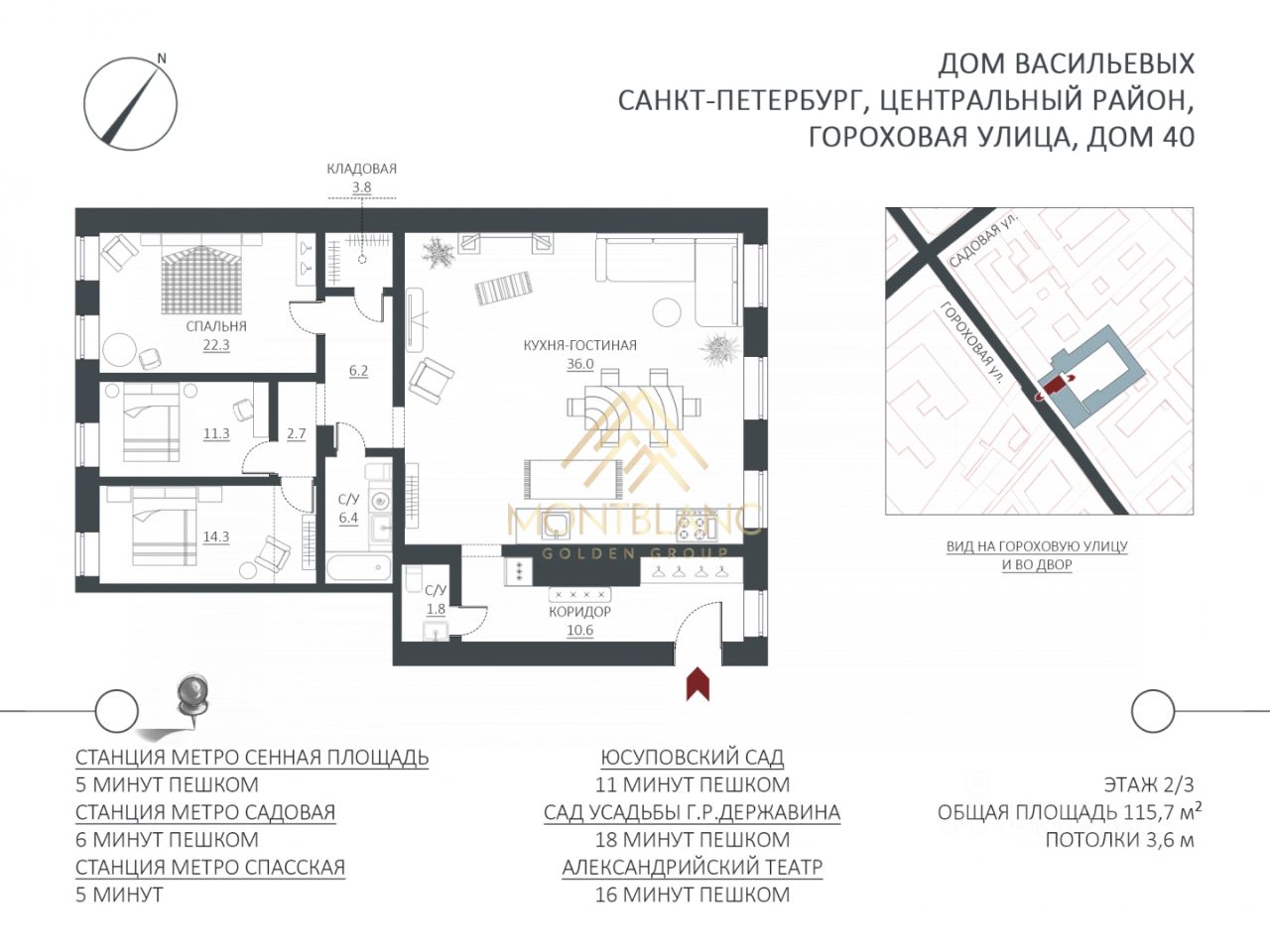 Три изолированные комнаты: 22, 18 и 14 м² — светлые, с окнами на Гороховую.