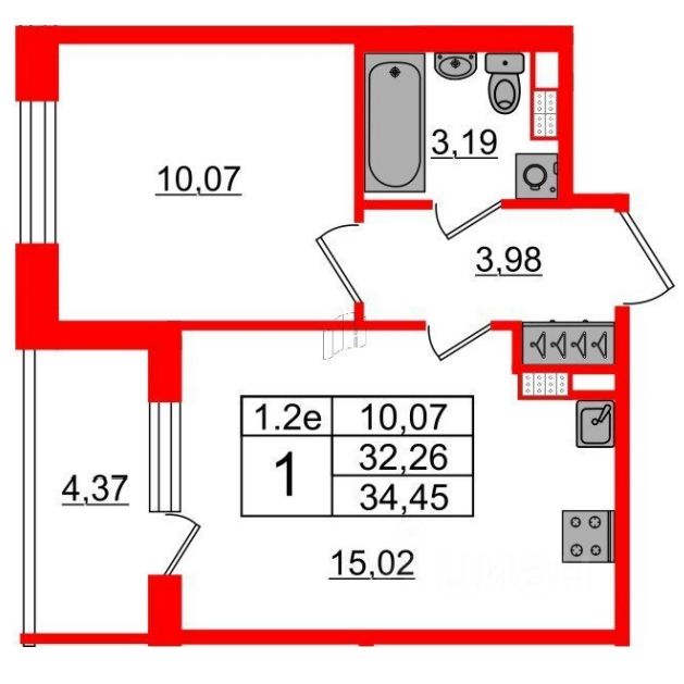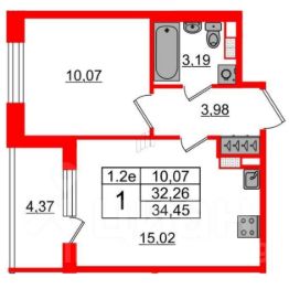 Несмотря на небольшую площадь, квартира вмещает в себя: кухню-гостиную, отдельную спальню, прихожую с нишей под шкаф и ванную комнату, позволяющую вместить ванную.