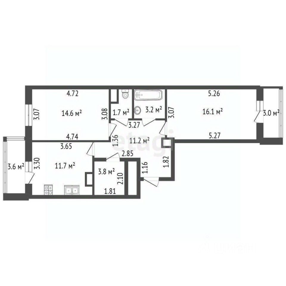 Планировка: 2 изолированные комнаты (16,1 м² и 14,6 м²), просторная кухня 11,7 м², гардеробная 4 м².