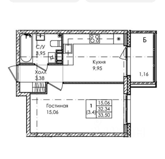Однокомнатная квартира площадью 33,5 м² в ЖК Лисино. Сдача дома в 3 квартале 2025 года!