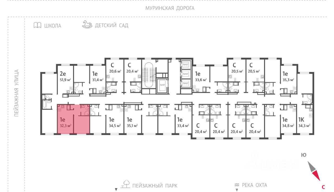 Вдоль леса и рядом с рекой Охта. К 2026 году на берегах реки Охты будет создан Пейзажный парк с летними экотропами и зимними горками для тюбингов, скейт-парком и летним кинотеатром.