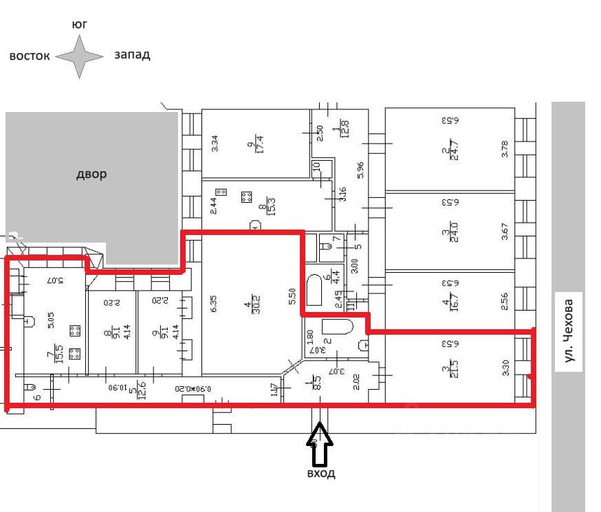 Ориентация по сторонам света — окна выходят на 3 стороны: юг, восток и запад. Часть выходит на тихую улицу Чехова, часть — во двор.