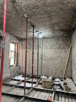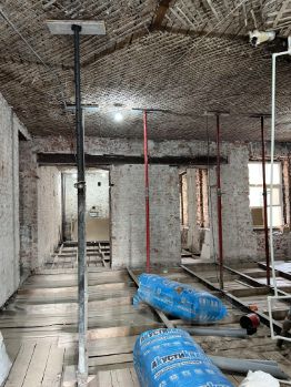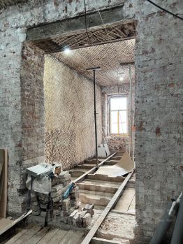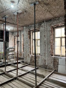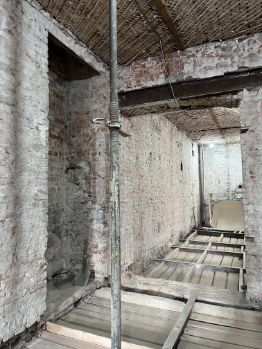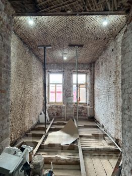 Хорошее состояние конструкций: металлические перекрытия с деревянным наполнением. Дерево сухое, без каких-либо повреждений. Стены кирпич, толщина внешних стен 80 см.