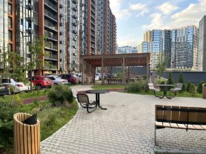 Рядом с ЖК озелененная площадь Европы со множеством скамеек.