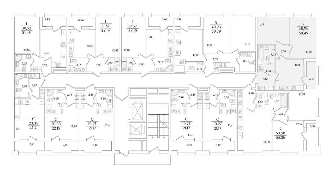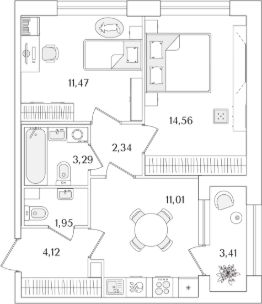 Квартира находится в 15 этажном доме, в Аурум - Корпус 2 на 3 этаже. Общая площадь квартиры 50,45 кв.м.
