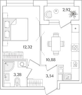 Квартира находится в 15 этажном доме, в Аурум - Корпус 2 на 5 этаже. Общая площадь квартиры 31,48 кв.м.