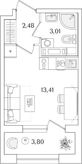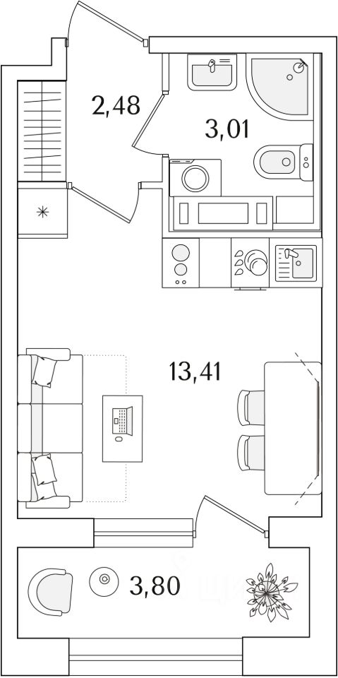 Квартира находится в 15 этажном доме, в Аурум - Корпус 2 на 15 этаже. Общая площадь квартиры 20,80 кв.м.
