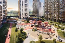 Внутри комплекса создана комфортная и современная жилая среда. Закрытый внутренний двор с креативным пространством, современным озеленением, выразительной геопластикой, большим плейхабом, беговым маршрутом станет идеальным местом для игр, отдыха, прогулок и общения.