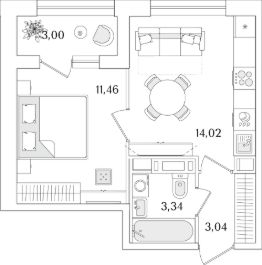 Квартира находится в 15 этажном доме, в Аурум - Корпус 2 на 9 этаже. Общая площадь квартиры 33,36 кв.м.