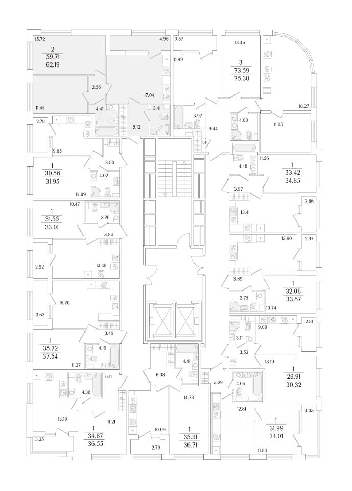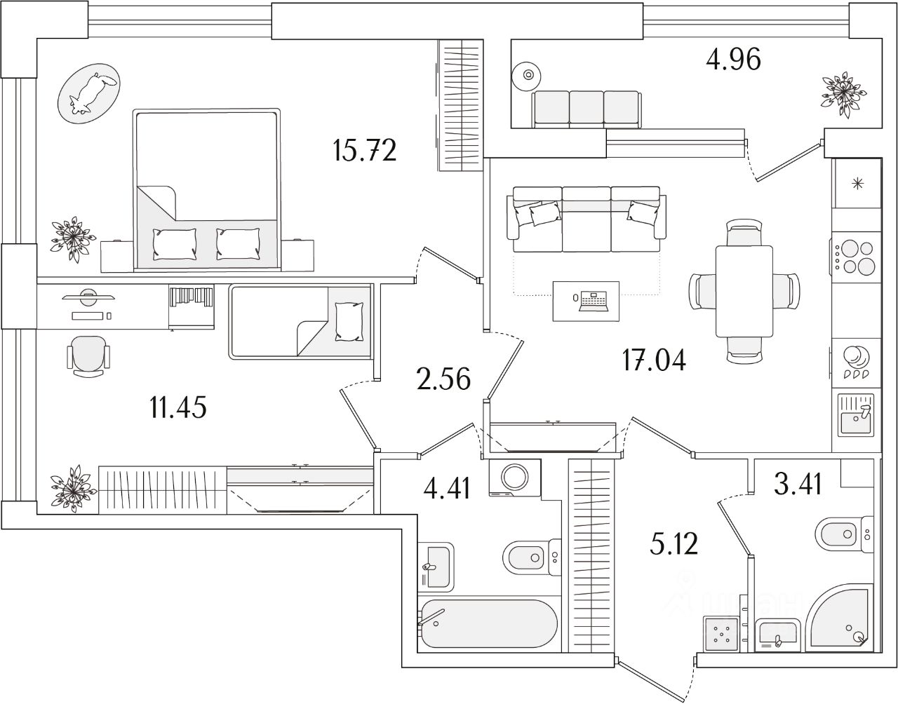 Квартира находится в 17 этажном доме, в Аурум - Корпус 1(С1,С2,С3) на 2 этаже. Общая площадь квартиры 62,19 кв.м.
