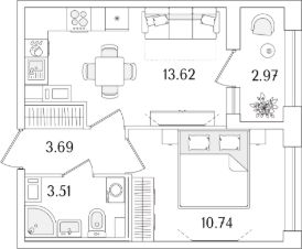 Квартира находится в 17 этажном доме, в Аурум - Корпус 1(С1,С2,С3) на 12 этаже. Общая площадь квартиры 33,05 кв.м.