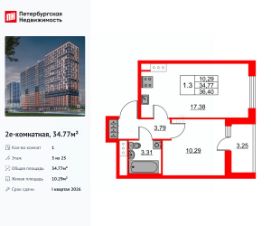 Удобная, классическая, функциональная европланировка, большая кухня-гостиная 17.38 м², вместительная прихожая 3.79 м². Общая площадь квартиры - 34.77 м², жилая 10.29 м², высота потолка 2.77 м.