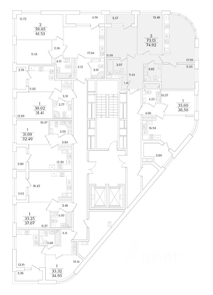 Квартира находится в 17 этажном доме, в Аурум - Корпус 1(С1,С2,С3) на 15 этаже. Общая площадь квартиры 74,92 кв.м.