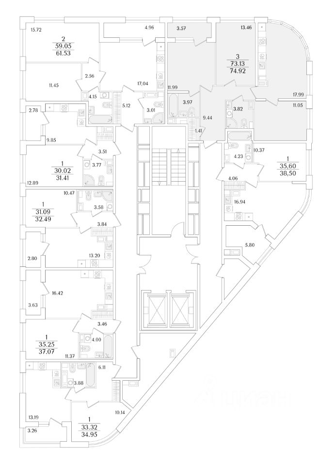 Квартира находится в 17 этажном доме, в Аурум - Корпус 1(С1,С2,С3) на 17 этаже. Общая площадь квартиры 74,92 кв.м.