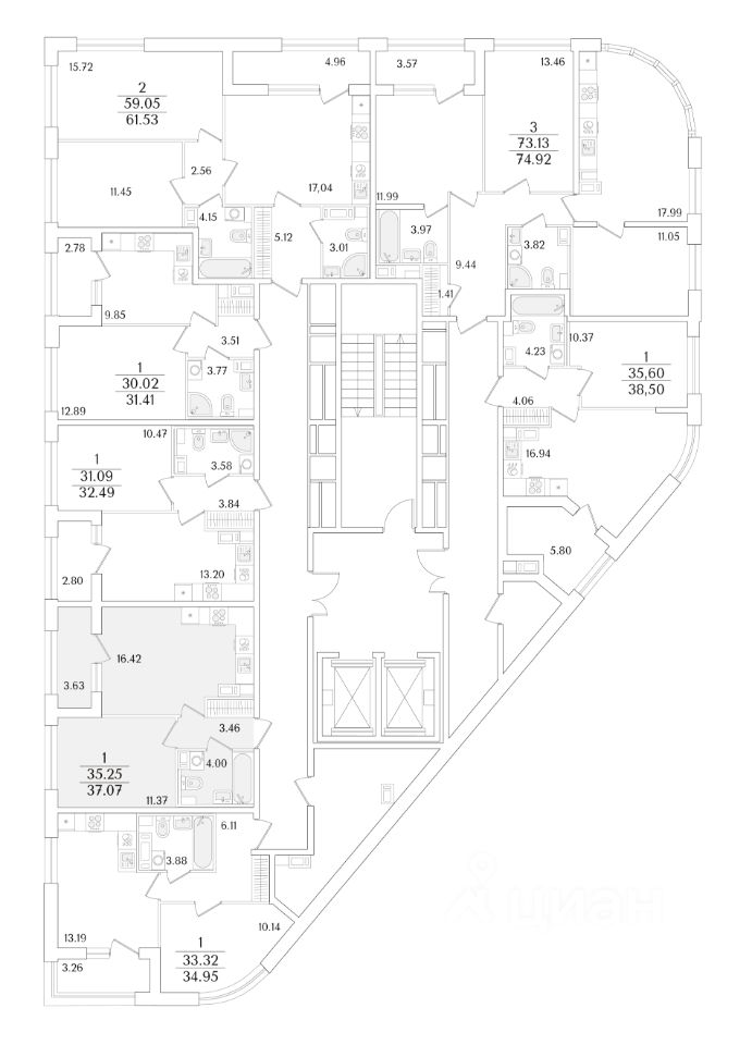 Квартира находится в 17 этажном доме, в Аурум - Корпус 1(С1,С2,С3) на 17 этаже. Общая площадь квартиры 37,07 кв.м.