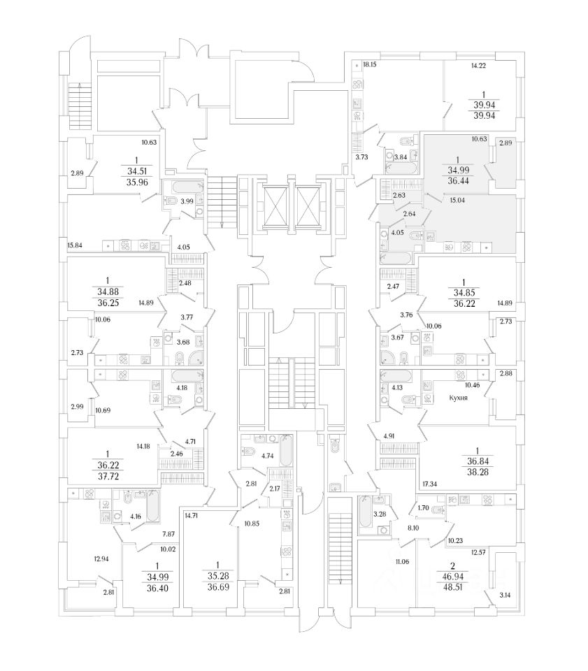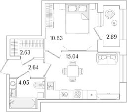 Квартира находится в 17 этажном доме, в Аурум - Корпус 1(С1,С2,С3) на 1 этаже. Общая площадь квартиры 36,44 кв.м.