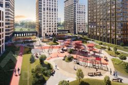 Внутри комплекса создана комфортная и современная жилая среда. Закрытый внутренний двор с креативным пространством, современным озеленением, выразительной геопластикой, большим плейхабом, беговым маршрутом станет идеальным местом для игр, отдыха, прогулок и общения.