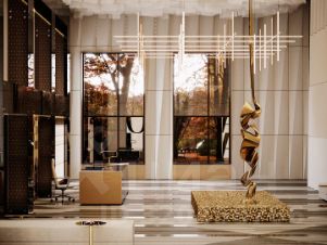 Одно из знаковых пространств жилого комплекса "Аурум" — центральная входная группа. Это место, сочетающее множество ролей. Это и визуальный акцент и статусное фотогеничное пространство и территория отдыха и встреч для жителей.