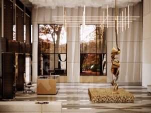 Одно из знаковых пространств жилого комплекса "Аурум" — центральная входная группа. Это место, сочетающее множество ролей. Это и визуальный акцент и статусное фотогеничное пространство и территория отдыха и встреч для жителей.