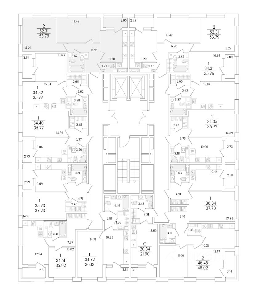 Квартира находится в 17 этажном доме, в Аурум - Корпус 1(С1,С2,С3) на 11 этаже. Общая площадь квартиры 53,79 кв.м.