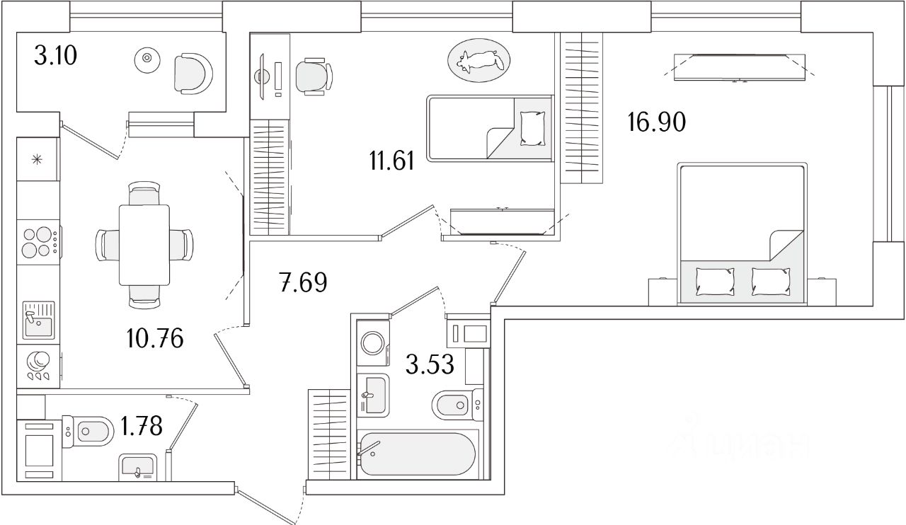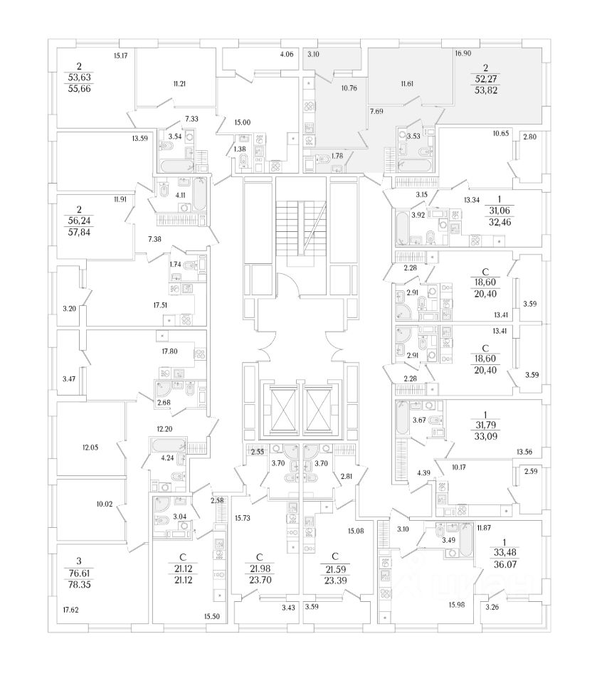 Квартира находится в 17 этажном доме, в Аурум - Корпус 1(С1,С2,С3) на 2 этаже. Общая площадь квартиры 53,82 кв.м.
