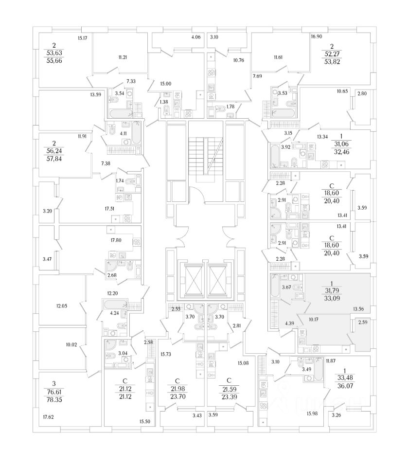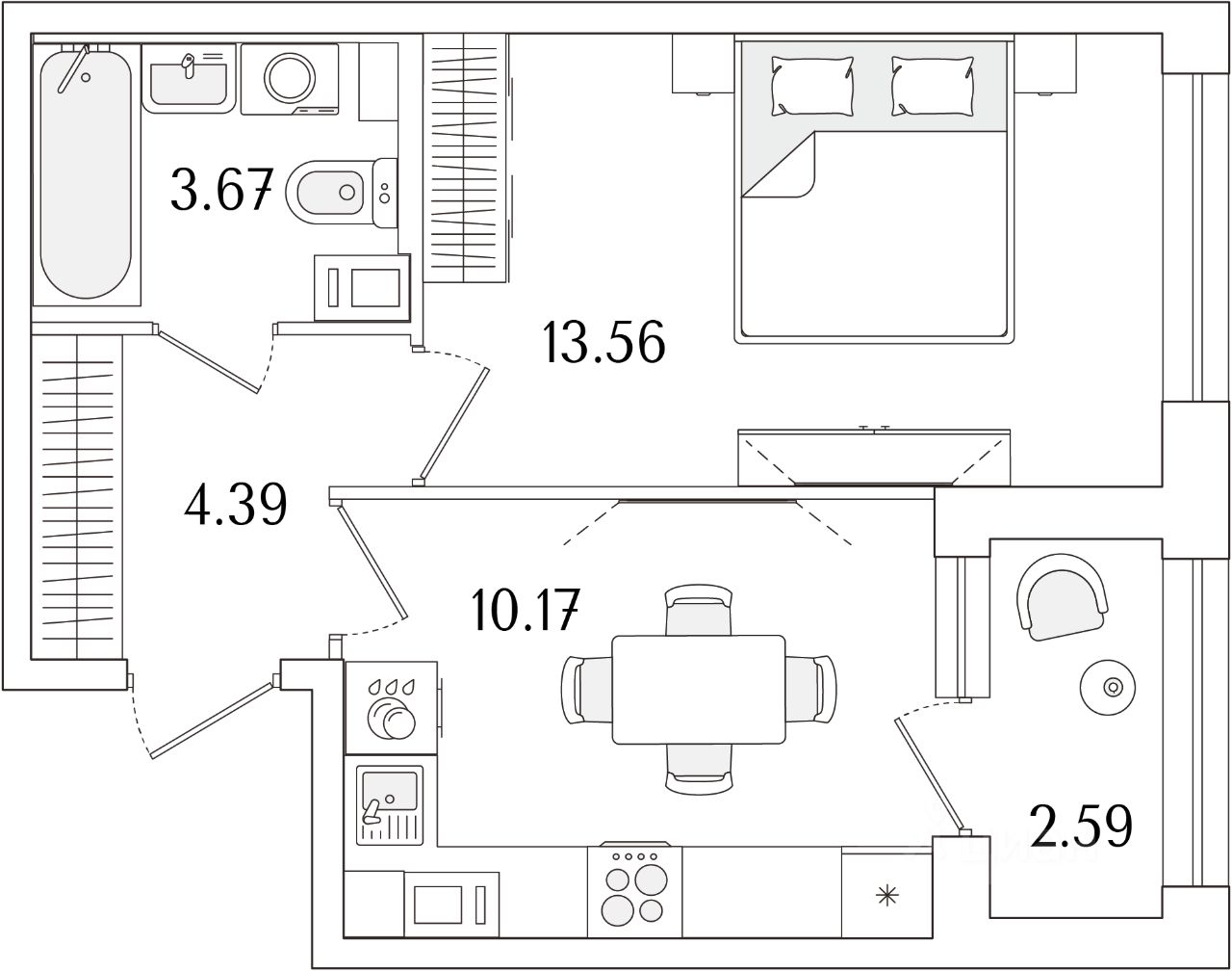 Квартира находится в 17 этажном доме, в Аурум - Корпус 1(С1,С2,С3) на 2 этаже. Общая площадь квартиры 33,09 кв.м.