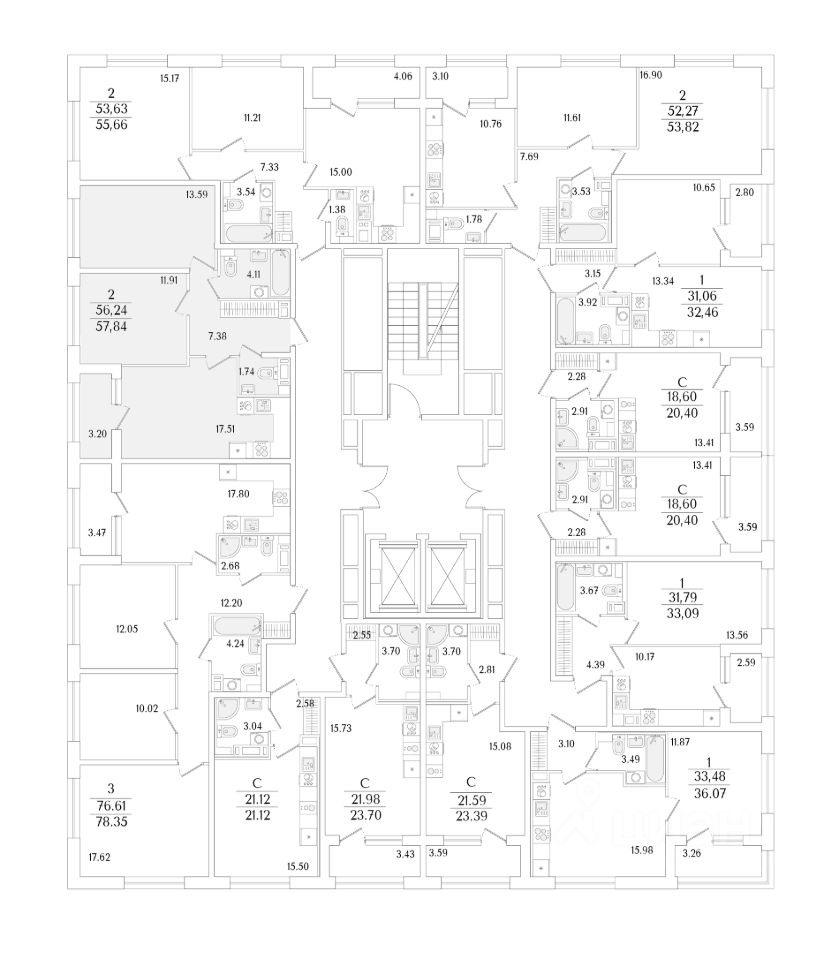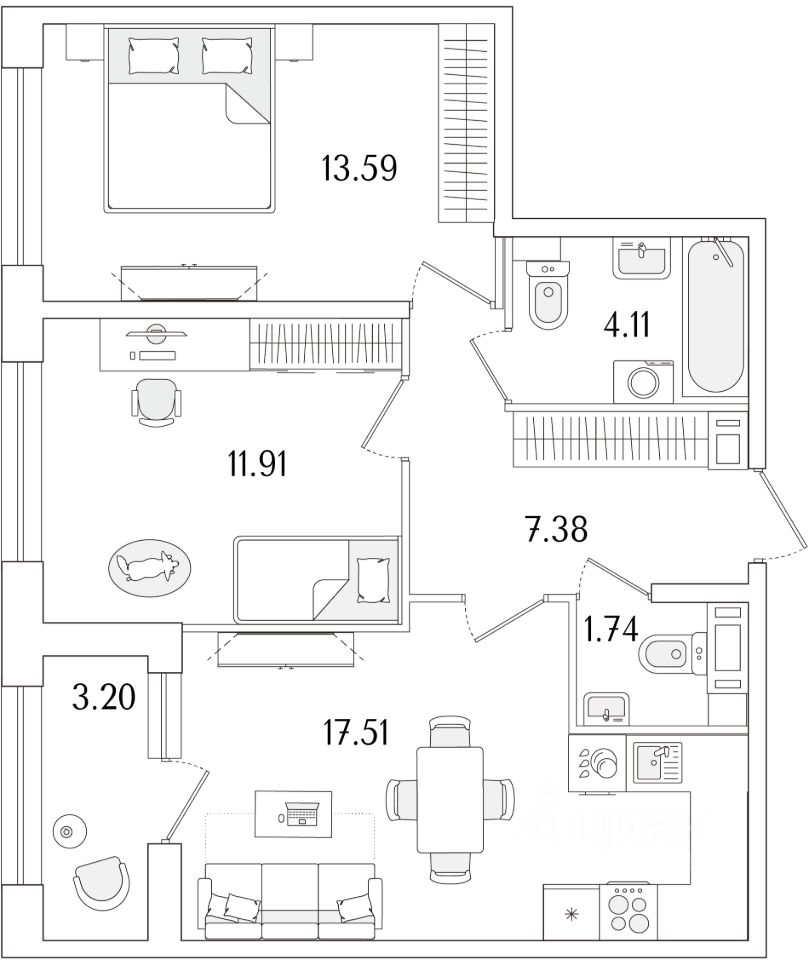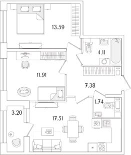 Квартира находится в 17 этажном доме, в Аурум - Корпус 1(С1,С2,С3) на 2 этаже. Общая площадь квартиры 57,84 кв.м.