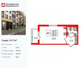 Удобная, классическая, функциональная европланировка, вместительная прихожая 3.15 м². Общая площадь студии - 24.71 м², жилая 18.31 м², высота потолка 2.77 м.