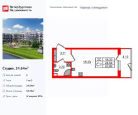 Уникальная, функциональная европланировка, вместительная прихожая 3.11 м². Общая площадь студии - 24.64 м², жилая 18.33 м², высота потолка 2.77 м.