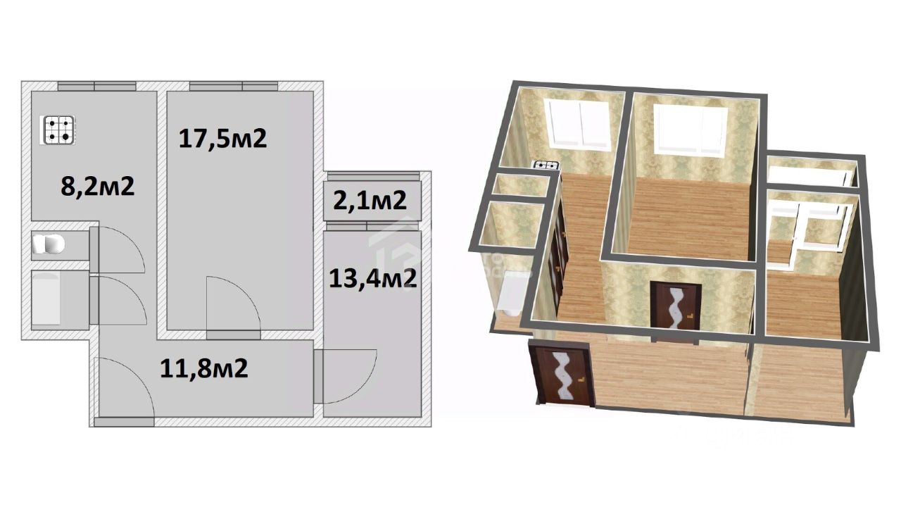 В квартире две изолированные комнаты площадью 13,4+ 17,5 м2 соответственно. Квартира односторонняя, южная сторона, солнечная , вид из окна во двор позволяет наслаждаться зеленью вокруг.