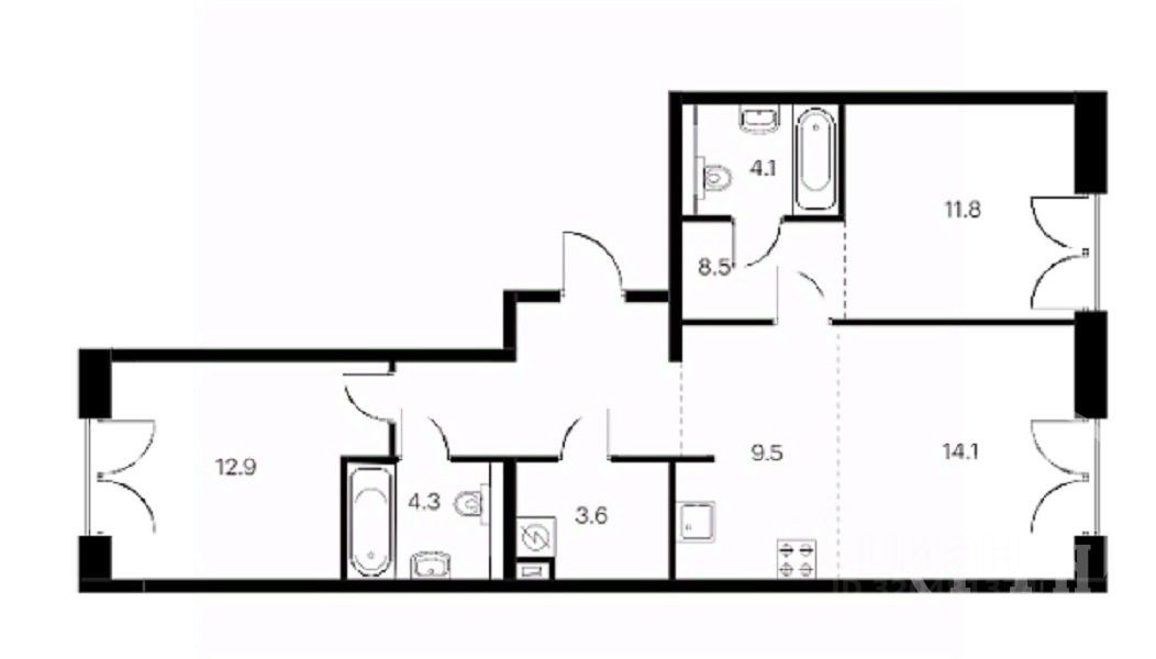 В квартире 2 санузла по 4,3м2+ 4,1 м2
