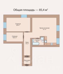 - Планировка включает: кухню-гостиную 31 м2, изолированные комнаты: 10,4 и 20 м2, санузел 6 м2 с ванной и душевой кабиной, холл- прихожая 14 м2;