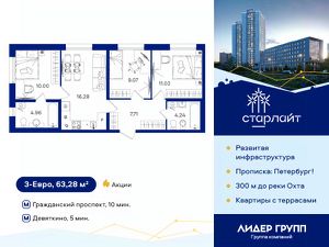 Скидка 1% жителям района. Жилой комплекс комфорт-класса "Старлайт" в Красногвардейском районе Санкт-Петербурга. В 300 метрах от берега реки Охта у Новоохтинского парка. Новая большая школа прямо рядом с домом! Это зеленый активно развивающийся и благоустраиваемый квартал Петербурга, где природный ландшафт идеально сочетается с хорошей транспортной доступностью и развитой, сложившейся инфраструктурой. Проект состоит из двух устремленных ввысь 25-этажных современных башен и 7-ми этажного корпуса переменной этажности с индивидуальными террасами. Жилые корпуса объединены галереей-стилобатом, в которой будут располагаться магазины, пекарни, аптеки и салоны красоты. Двор закрыт от посторонних и приподнят, что обеспечит дополнительную приватность проживания. Во дворе будет выполнено авторское благоустройство, в том числе уникальная проекция звездного неба