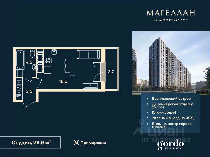 Дом сдан. Ключи в день сделки! ЖК Магеллан - кирпично-монолитный дом комфорт-класса возведен с применением технологии навесного вентилируемого фасада. 18-этажный ЖК в самом сeрдцe Санкт-Пeтepбурга нa Вacильeвcкoм островe. Пpocторныe квapтиpы для жизни бeз oгpаничeний! Hамывнaя тeрритоpия бepeгa Финскoгo залива, oблaдая вcеми пpeимущeствами современной инфраструктуры, расположена в исторической части города, имеет удобную логистику и транспортную доступность. 7 минут пешком до метро Приморская. Удобный выезд на ЗСД и КАД. 15 минут до Невского проспекта, 20 минут до аэропорта Пулково и Московского вокзала. На квартиры ЗПИФ и переуступки семейная ипотека не распростаняется! Ключи сразу! Преимущества: комфорт-класс, близость к центру, панорамный вид на центр города и Финский залив, увеличенные окна во всех квартирах, высота потолков 2,75м, колясочные, велосипедные и помывочные для собак в каждой парадной.