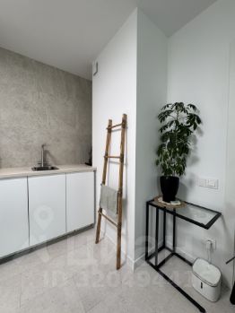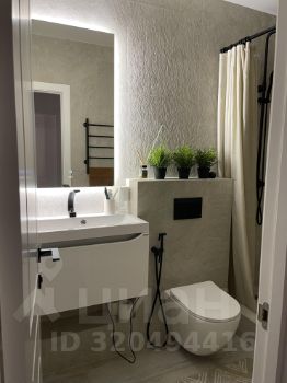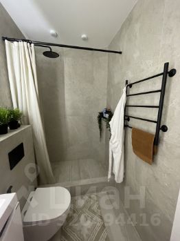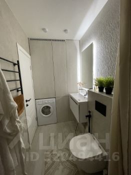 На полу плитка, полы с подогревом, большая душевая, инсталляция, встроенный шкаф с стиральной машиной.