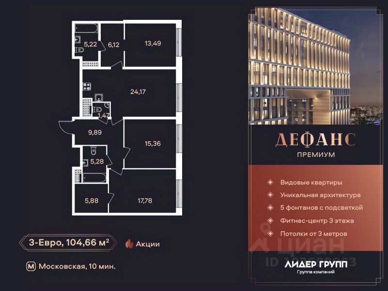 ЖК "Дефанс Премиум". Строительство завершено. Дом получил заключение о соответствии и готовится к вводу! Это проект авторской архитектуры с уникальными форматами квартир в 10 минутах ходьбы от станции метро "Московская". Дом выполнен в виде двух 23-х этажных арок, основания которых объединены единым внутренним пространством с большой парадной лестницей, променадом и большим фонтанным комплексом с подсветкой. В составе проекта построен большой фитнес-центр с бассейнами и зоной СПА. Часть квартир отделена от остальных жилых этажей специальным техническим этажом — это снимает все ограничения по перепланировке. Для части квартир предусмотрены индивидуальные входные группы и дополнительные лифты премиального немецкого бренда Tyssen Krupp (TKE). Фасады, облицованные испанской керамикой и алюминиевые панорамные окна с энергоэффективными стеклами AGС Energy подчеркивают высокий статус дома. На квартиры ЗПИФ и переуступки семейная ипотека не распространяется!