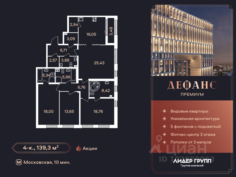 ЖК "Дефанс Премиум". Строительство завершено. Дом получил заключение о соответствии и готовится к вводу! Это проект авторской архитектуры с уникальными форматами квартир в 10 минутах ходьбы от станции метро "Московская". Дом выполнен в виде двух 23-х этажных арок, основания которых объединены единым внутренним пространством с большой парадной лестницей, променадом и большим фонтанным комплексом с подсветкой. В составе проекта построен большой фитнес-центр с бассейнами и зоной СПА. Часть квартир отделена от остальных жилых этажей специальным техническим этажом — это снимает все ограничения по перепланировке. Для части квартир предусмотрены индивидуальные входные группы и дополнительные лифты премиального немецкого бренда Tyssen Krupp (TKE). Фасады, облицованные испанской керамикой и алюминиевые панорамные окна с энергоэффективными стеклами AGС Energy подчеркивают высокий статус дома. На квартиры ЗПИФ и переуступки семейная ипотека не распространяется!