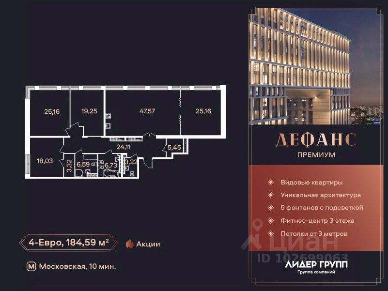 ЖК "Дефанс Премиум". Строительство завершено. Дом получил заключение о соответствии и готовится к вводу! Это проект авторской архитектуры с уникальными форматами квартир в 10 минутах ходьбы от станции метро "Московская". Дом выполнен в виде двух 23-х этажных арок, основания которых объединены единым внутренним пространством с большой парадной лестницей, променадом и большим фонтанным комплексом с подсветкой. В составе проекта построен большой фитнес-центр с бассейнами и зоной СПА. Часть квартир отделена от остальных жилых этажей специальным техническим этажом — это снимает все ограничения по перепланировке. Для части квартир предусмотрены индивидуальные входные группы и дополнительные лифты премиального немецкого бренда Tyssen Krupp (TKE). Фасады, облицованные испанской керамикой и алюминиевые панорамные окна с энергоэффективными стеклами AGС Energy подчеркивают высокий статус дома. На квартиры ЗПИФ и переуступки семейная ипотека не распространяется!