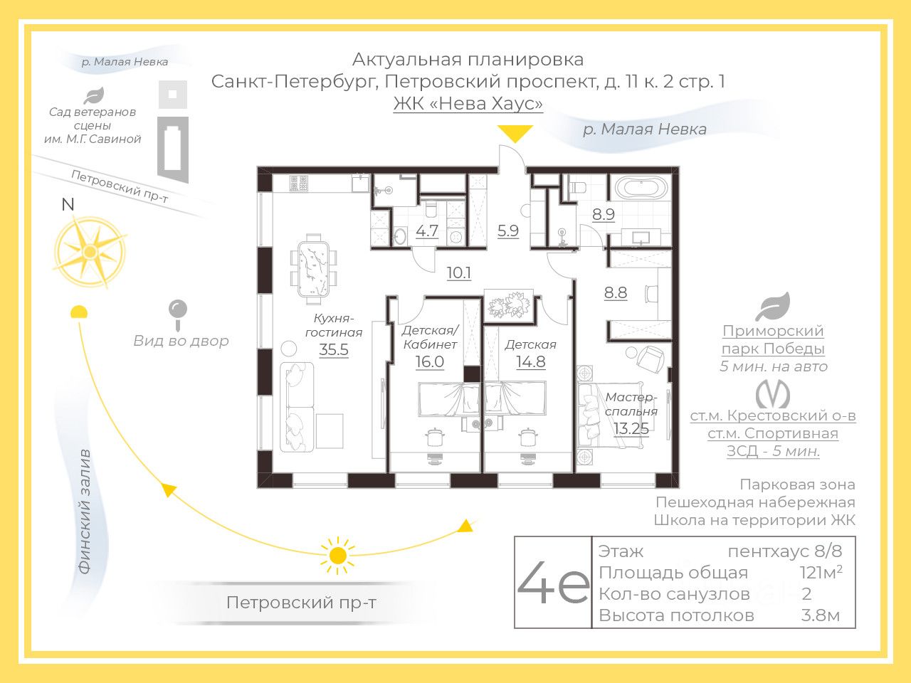 До метро Крестовский остров идти 15 минут. До центра города вы доберетесь за 15 минут на автомобиле, а до ЗСД ехать 7 минут. В пешей доступности несколько детских садов, в округе множество престижных школ