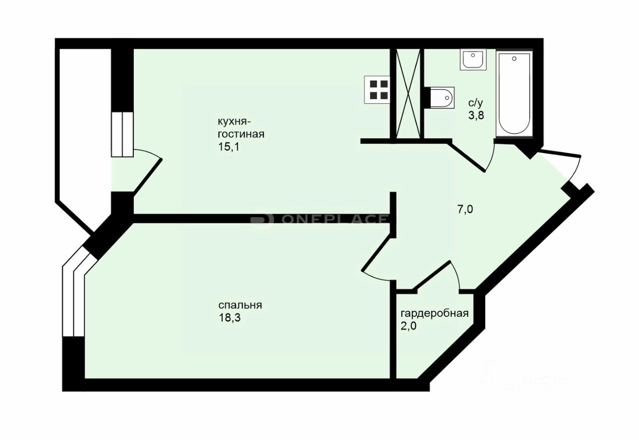 Жилая комната 18,3 м² — правильной формы, легко зонируется.