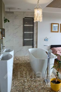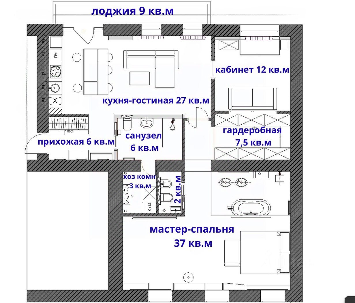 В квартире просторная кухня-гостиная площадью 27 кв.м с выходом на большую лоджию 9 кв.м, мастер-спальня площадью 37 кв.м с отдельной ванной и санузлом, кабинет 12 кв.м, большая оборудованная гардеробная 7,5 кв.м, второй просторный санузел 6 кв.м, хозяйственная комната 3 кв.м.
