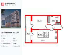 Удобная, классическая, функциональная европланировка, большая кухня-гостиная 16.82 м², вместительная прихожая 3.74 м². Общая площадь квартиры - 35.73 м², жилая 10.74 м², высота потолка 2.77 м.