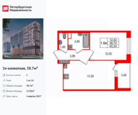 Удобная, классическая, функциональная европланировка, большая кухня-гостиная 17.25 м², вместительная прихожая 3.97 м². Общая площадь квартиры - 38.7 м², жилая 12.02 м², высота потолка 2.75 м.