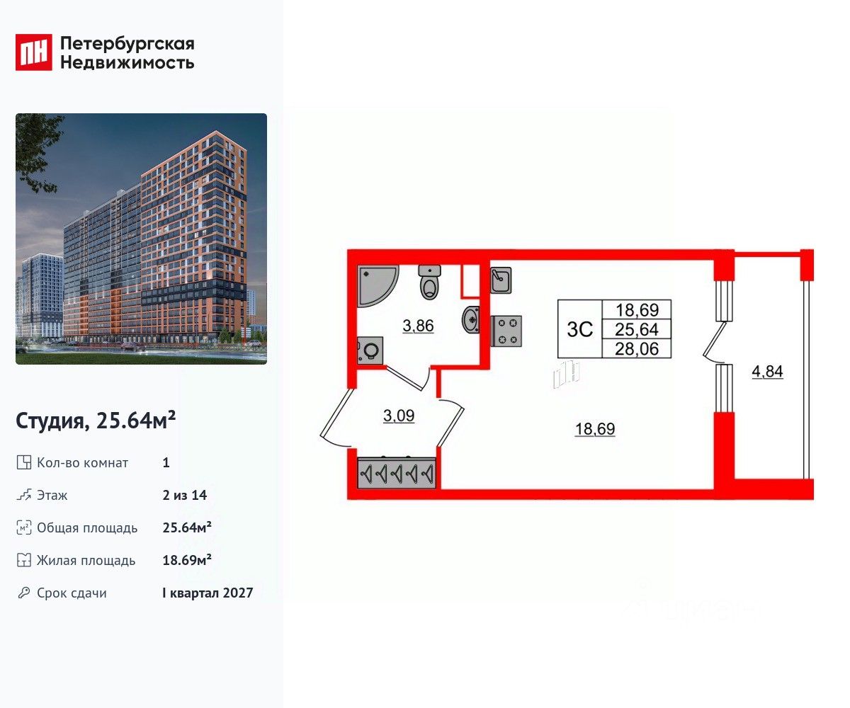 Удобная, классическая, функциональная европланировка, вместительная прихожая 3.09 м². Общая площадь студии - 25.64 м², жилая 18.69 м², высота потолка 2.75 м.