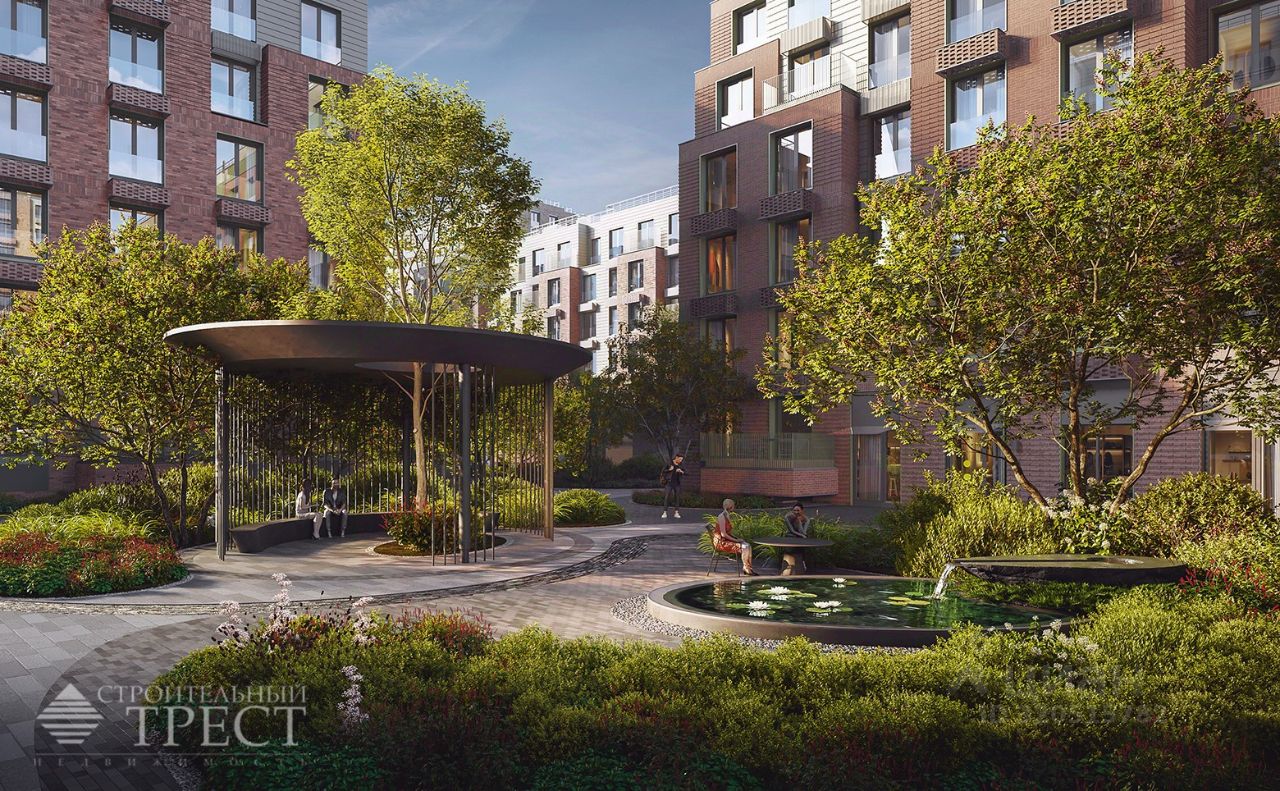 Закрытая охраняемая территория без машин, с детскими и спортивными площадками, амфитеатром и зонами отдыха.