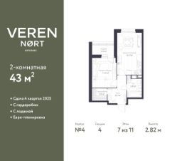 1-комн. квартира от застройщика в Veren Nort Сертолово на 7 этаже. Квартира без отделки, после получения ключей можно делать ремонт. Общая площадь: 43 кв.м., жилая: 11.23 кв.м., площадь просторной куxни-гостиной: 16.33 кв.м. Все окна выходят на одну сторону. В квартире одна лоджия, один совмещенный санузел. Высота потолков 2.82 м.