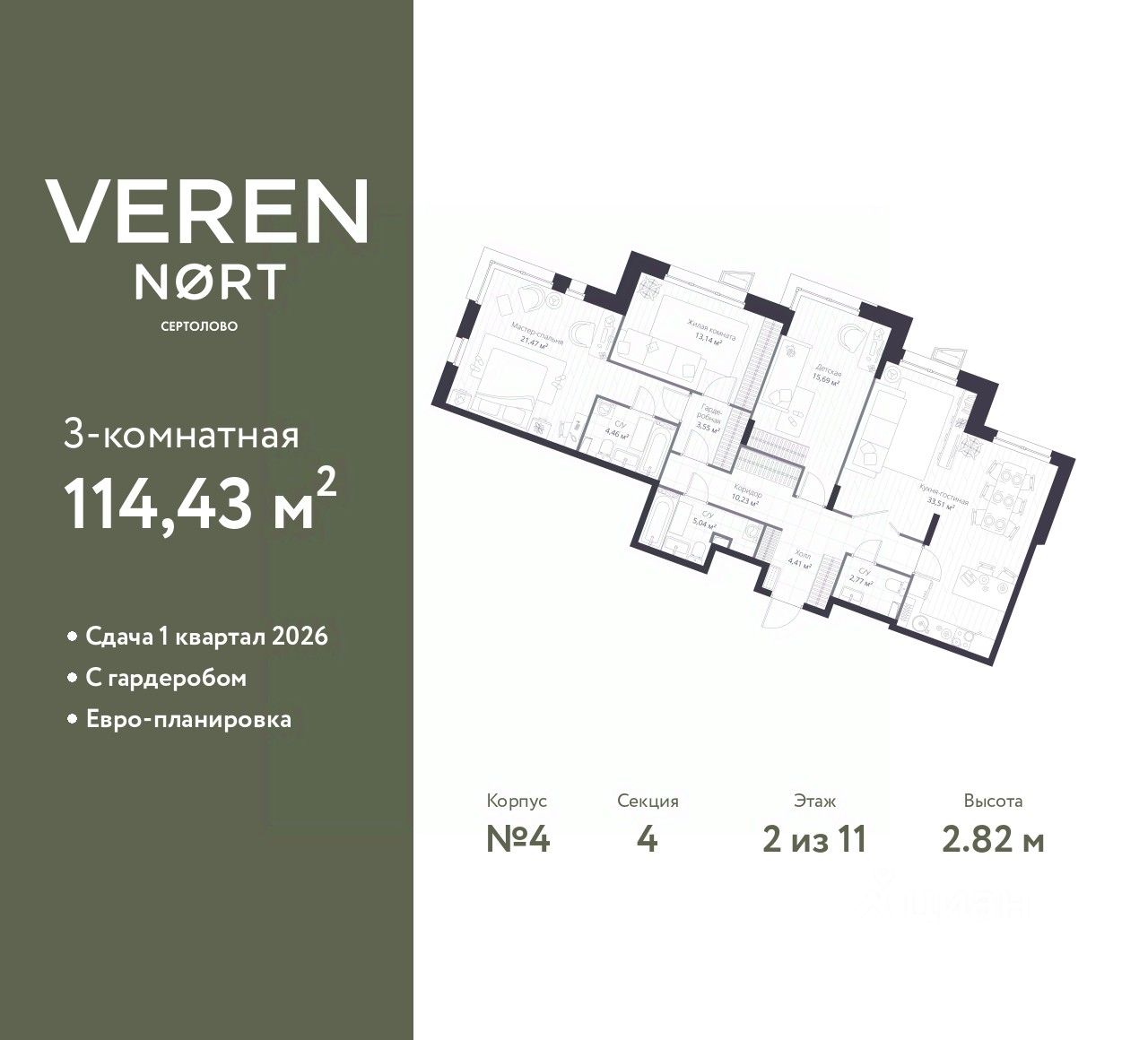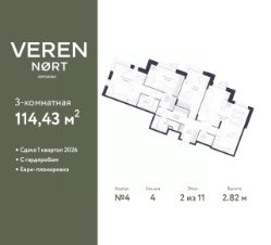 Продается 3-комн. квартира в Veren Nort Сертолово на 2 этаже. Квартира без отделки, полностью готова к чистовой отделке и дальнейшему ремонту. Общая площадь: 114.43 кв.м., жилая: 50.3 кв.м., площадь просторной куxни-гостиной: 33.51 кв.м. Угловая квартира, идеально подойдет любителям тишины и панорамных видов. В квартире два совмещенных и один раздельный санузел. Высота потолков 2.82 м.