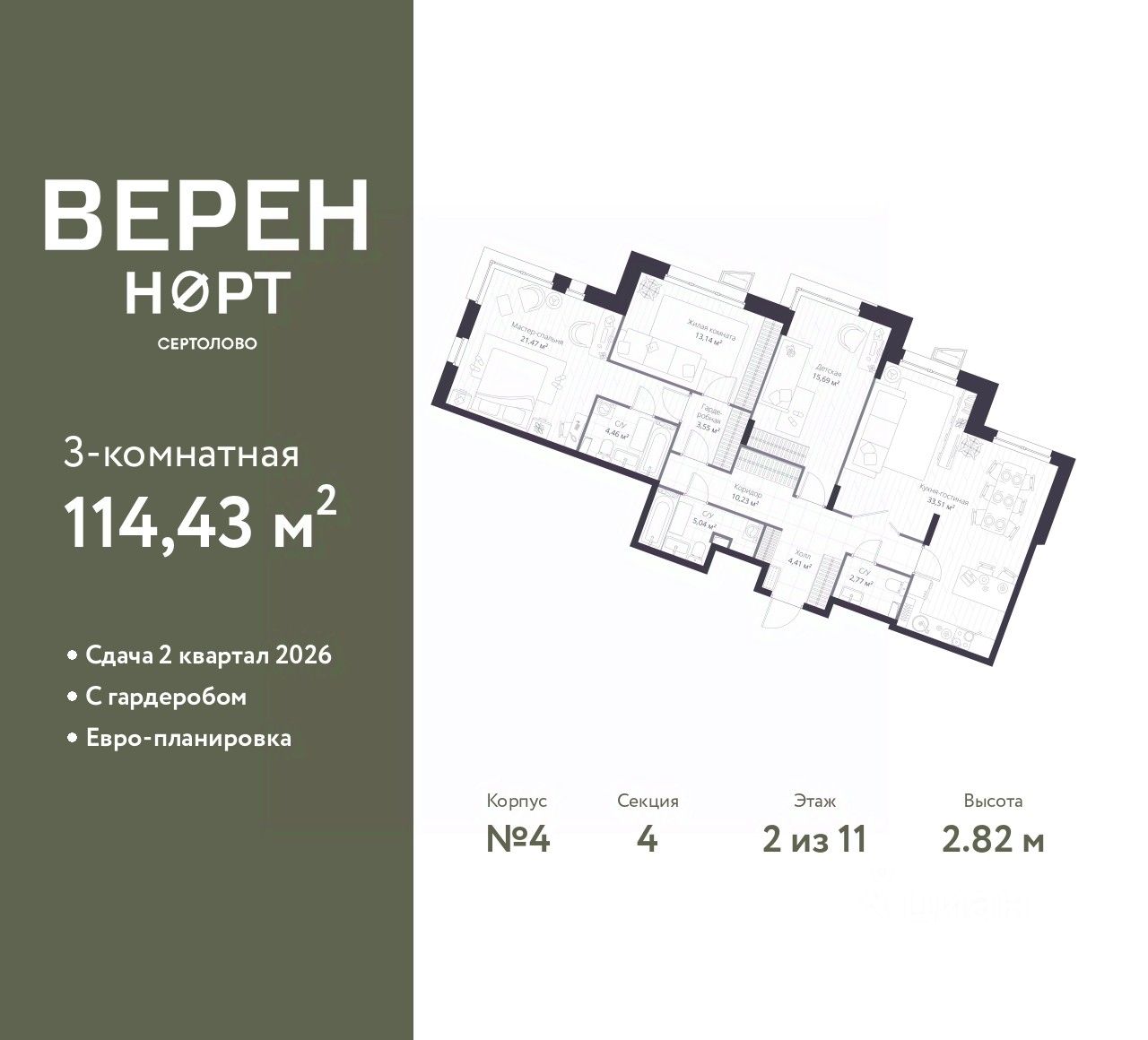 3-комн. квартира в ЖК "Верен Норт Сертолово" на 2 этаже. Квартира без отделки, после оформления собственности можно делать ремонт. Общая площадь: 114.43 кв.м., жилая: 50.3 кв.м., площадь просторной куxни-гостиной: 33.51 кв.м. Квартира угловая, окна oбecпeчивaют paвнoмepнoe ocвeщeниe в тeчeниe дня. В квартире два совмещенных и один раздельный санузел. Высота потолков 2.82 м.