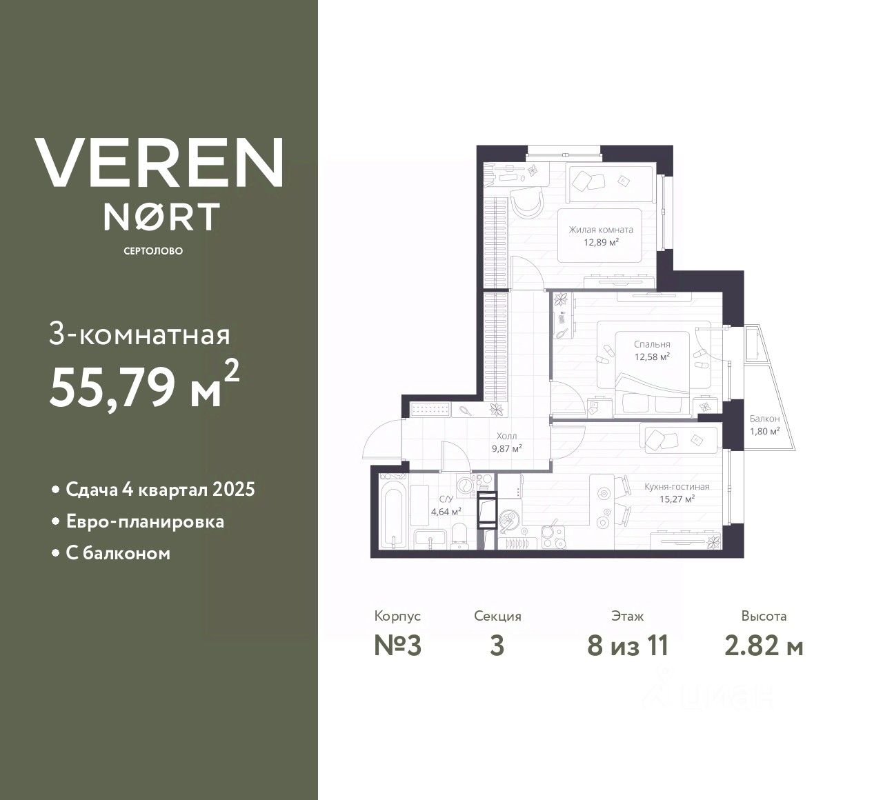 Продается 2-комн. квартира в Veren Nort Сертолово на 8 этаже. Квартира без отделки, новый владелец может сделать ремонт по своему дизайн-проекту. Общая площадь: 55.79 кв.м., жилая: 25.47 кв.м., площадь просторной куxни-гостиной: 15.27 кв.м. Угловая квартира, окна oбecпeчивaют paвнoмepнoe ocвeщeниe в тeчeниe дня. В квартире один балкон, один совмещенный санузел. Высота потолков 2.82 м.